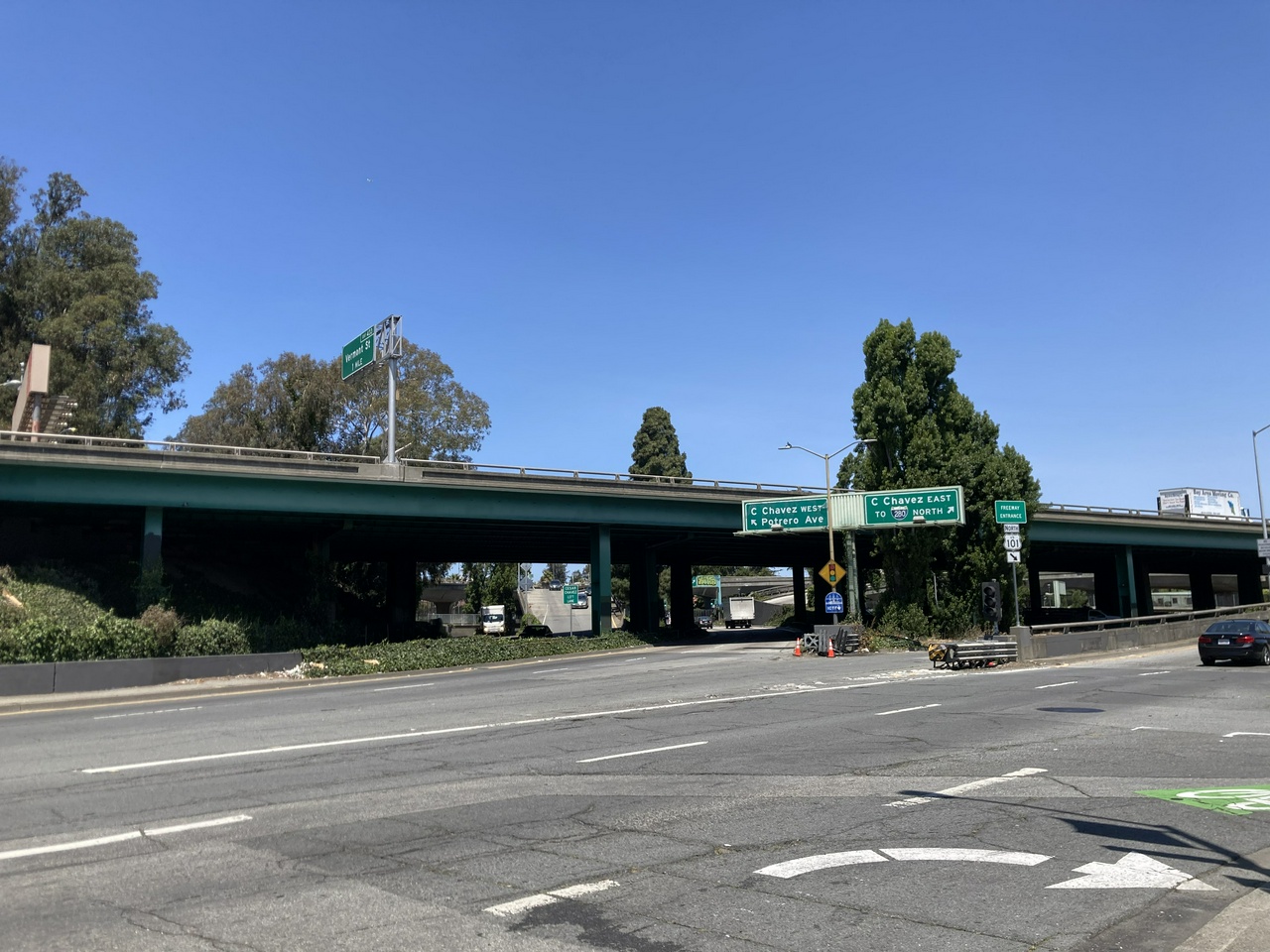 I’ve been feeling increasingly better, so I went for it on Monday when I got stuck on the SF General side waiting for the bus to take me to Bayshore. I slowly walked south and just as I remembered, what looked like sidewalks on the roads leading into the tangle all melted away until there was only road. But by carefully taking turns, I ended up still on tiny sidewalks until I passed what seemed to be the start of a foot or bicycle path under the overpass. It went off to one side, so I continued straight for a while, but once again the sidewalk was becoming narrower. I was walking against traffic and I found myself irrationally clinging to the tunnel wall, as I felt like I was walking directly into the cars. The only thing that kept me going was the prospect of turning around, walking back to the footpath, and being seen again by the trio of homeless guys who were sitting and talking near the beginning of the path. I suppose getting around on foot just is difficult sometimes, but I still felt embarrassed by the idea of these guys watching me be so confused about going under a bridge.